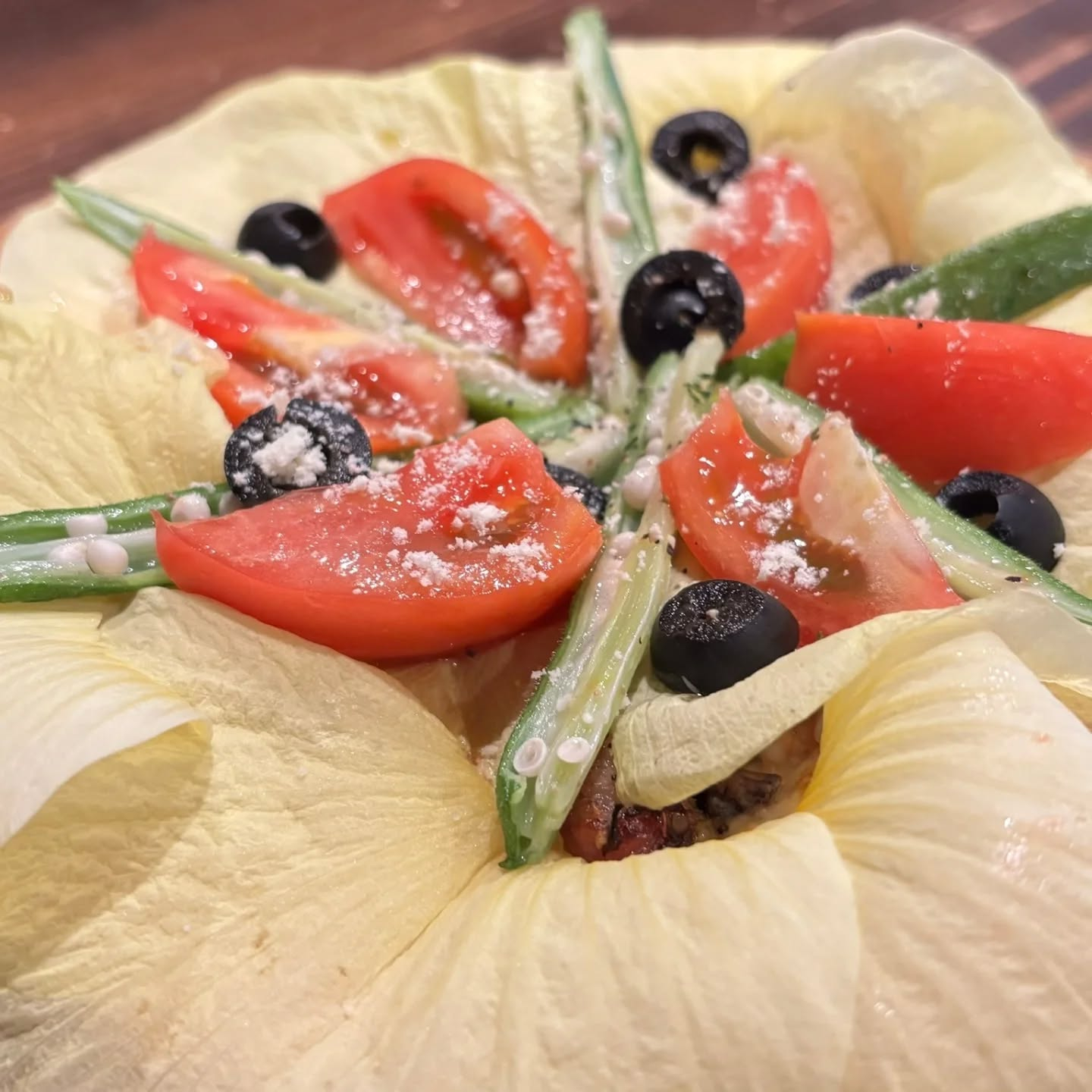 Ciao\(^o^)/♥Ciao\(^o^)/♥ 花オクラのピッツァ 名付けて ピッツァフィオーレ♥ お花のようなピッツァできました✨ 今朝採れたての花オクラが 届くのは 生産者さんに感謝 鮮度ある花びらの為 店内のみ提供とさせていただきます