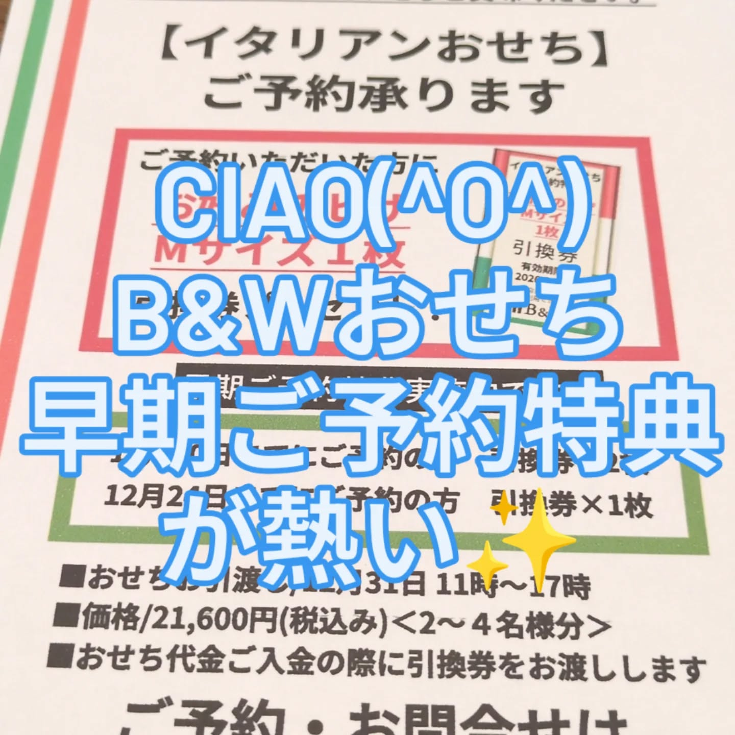 Ciao(^o^)♥Ciao(^o^)♥ 今年も年末に おせちをお作りします♥ すべて手作りです 年越しはB&Wおせちで✨ 今年は早期ご予約特典 お好きな ピッツァМサイズ引き換え券をプレゼント 12月10日まででしたら 2枚プレゼ […]